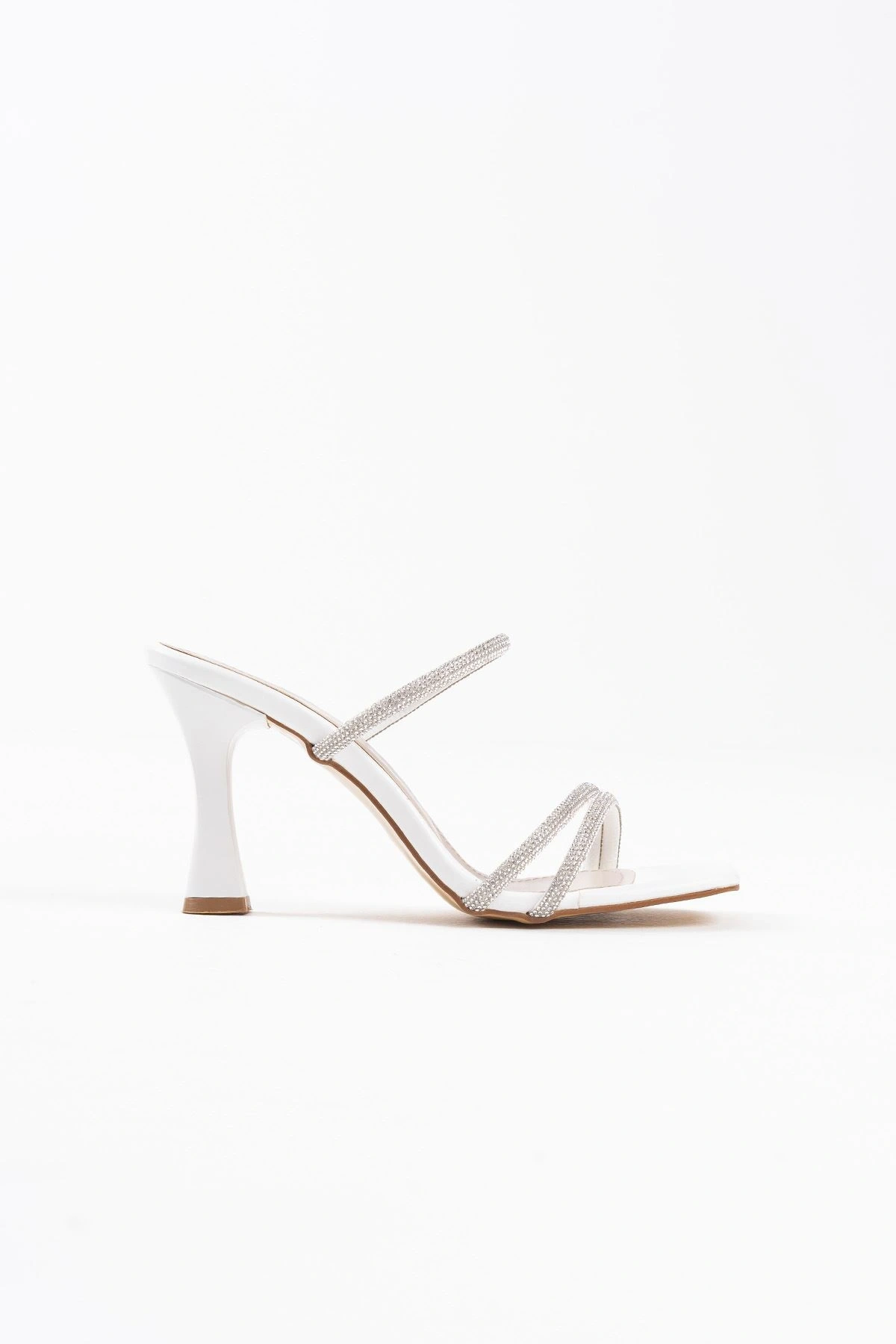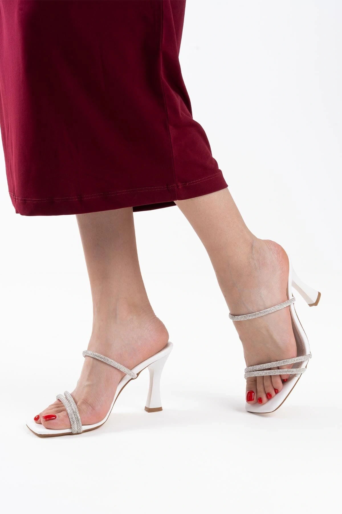 Alvina Beyaz Taşlı İnce Bantlı Kadın Topuklu Terlik