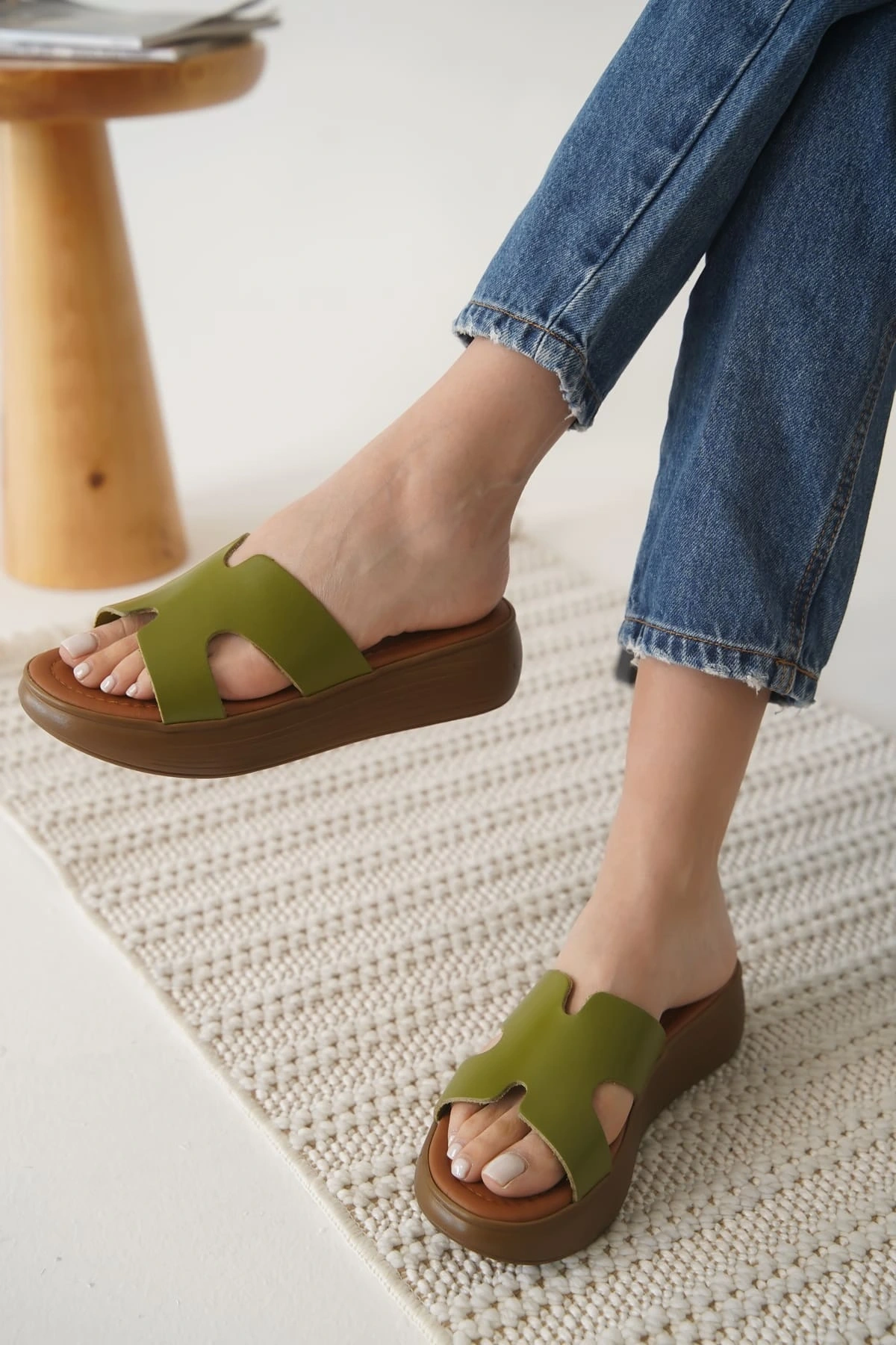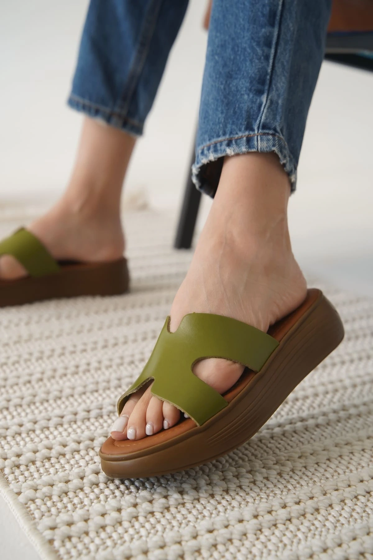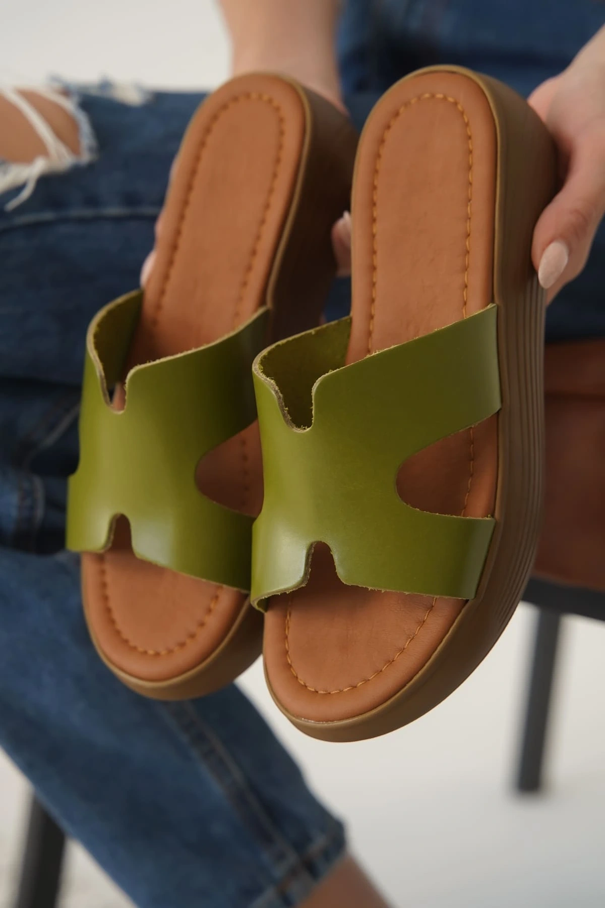Borlina Haki Yeşil Hakiki Deri Terlik
