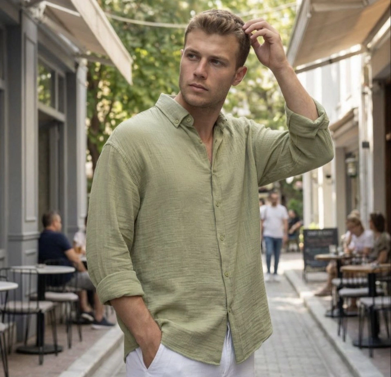 Erkek Yeşil Keten Gömlek