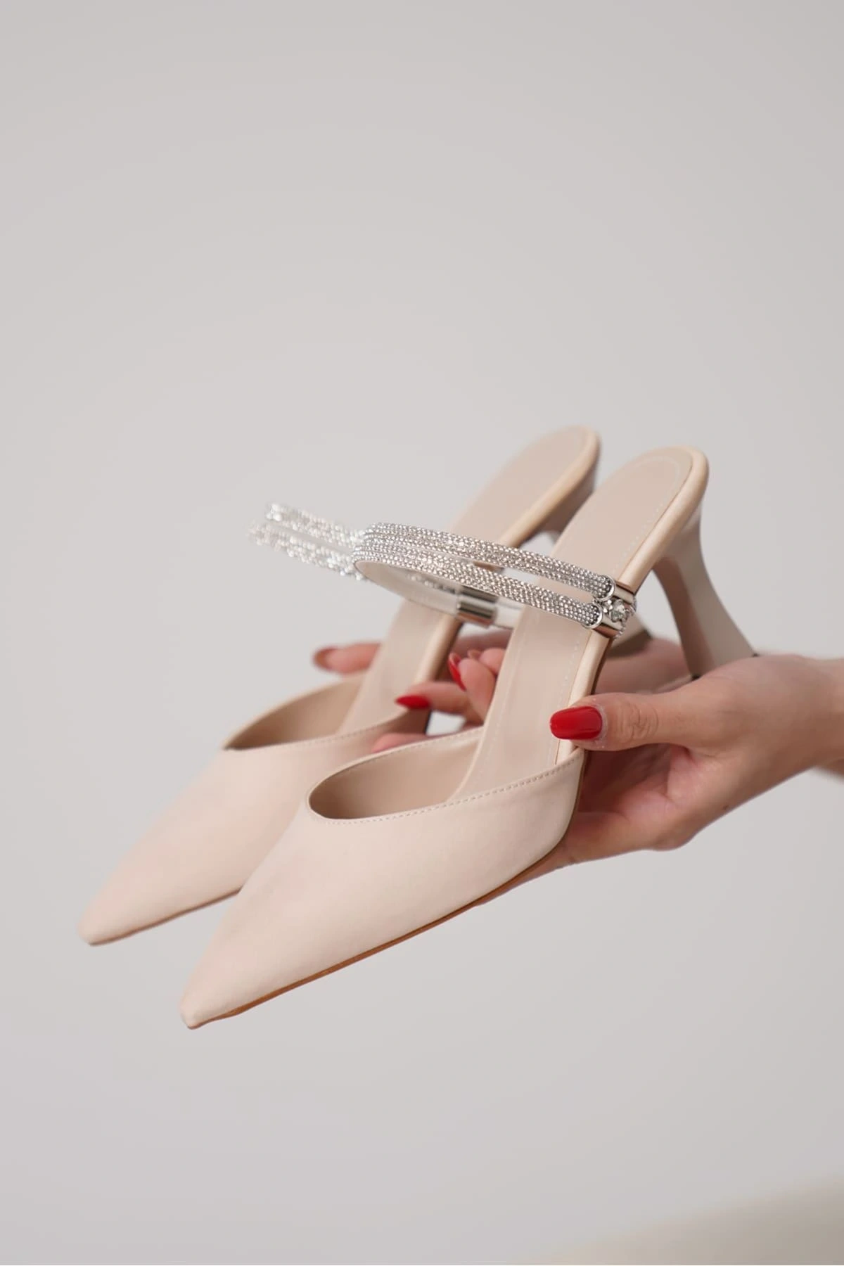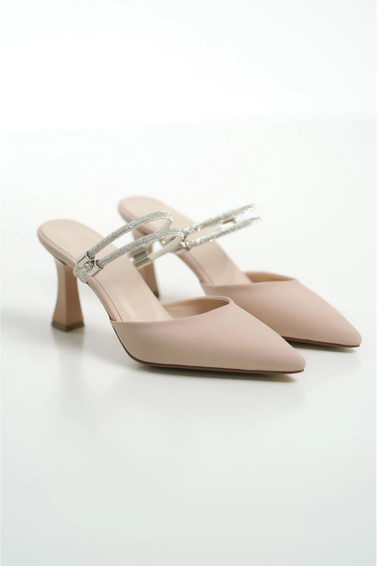 Georgina Kadın Taşlı Bej Saten Topuklu Ayakkabı