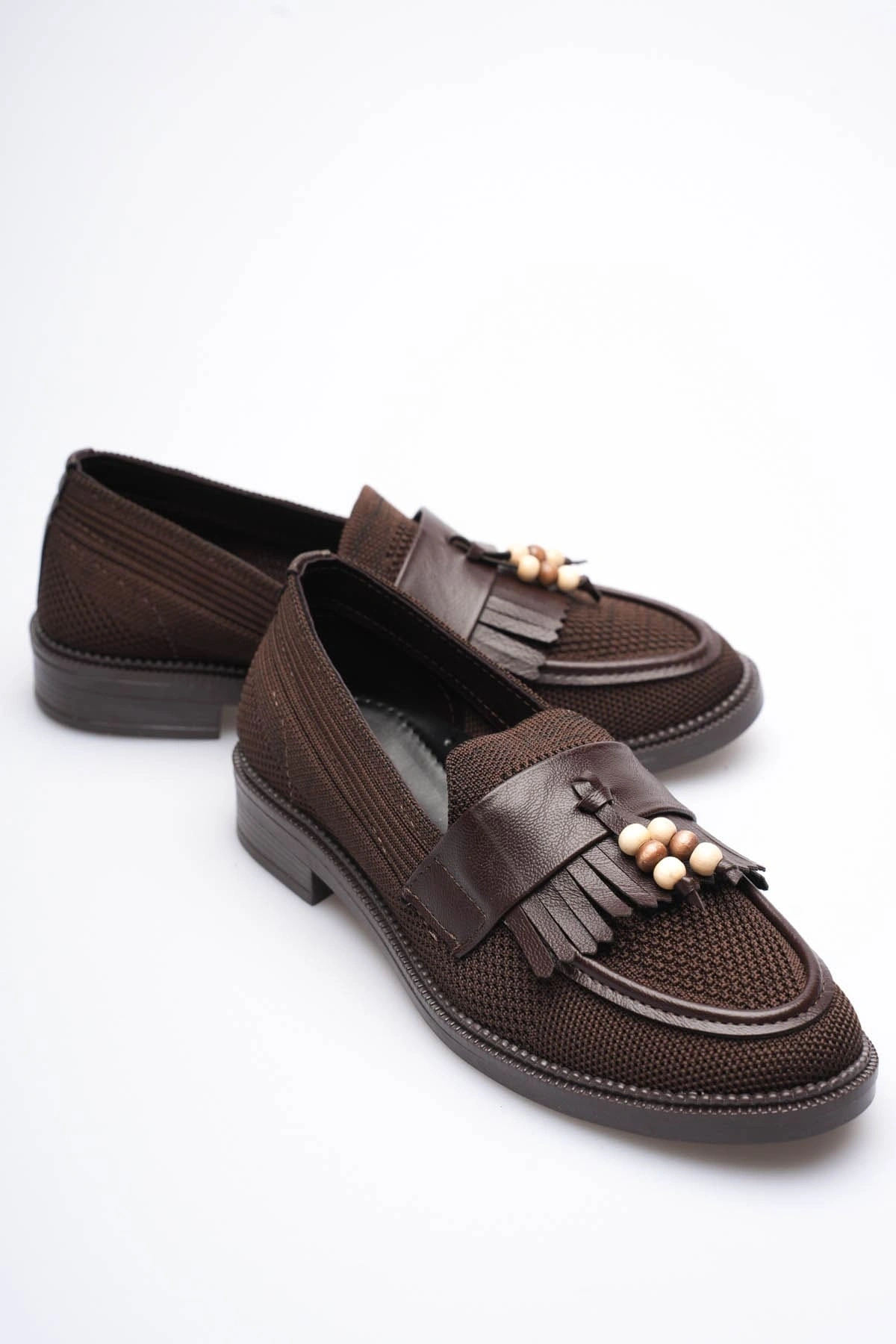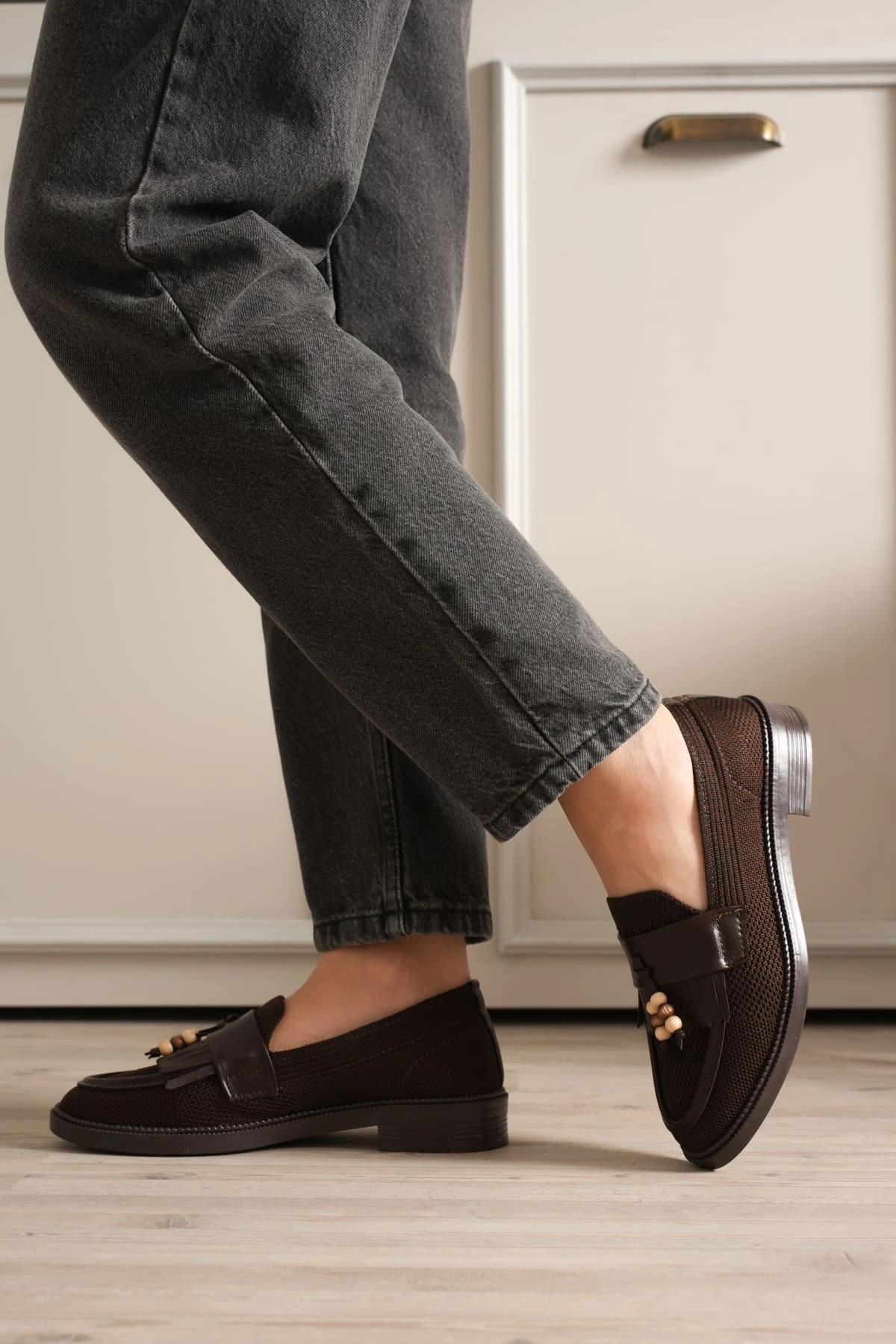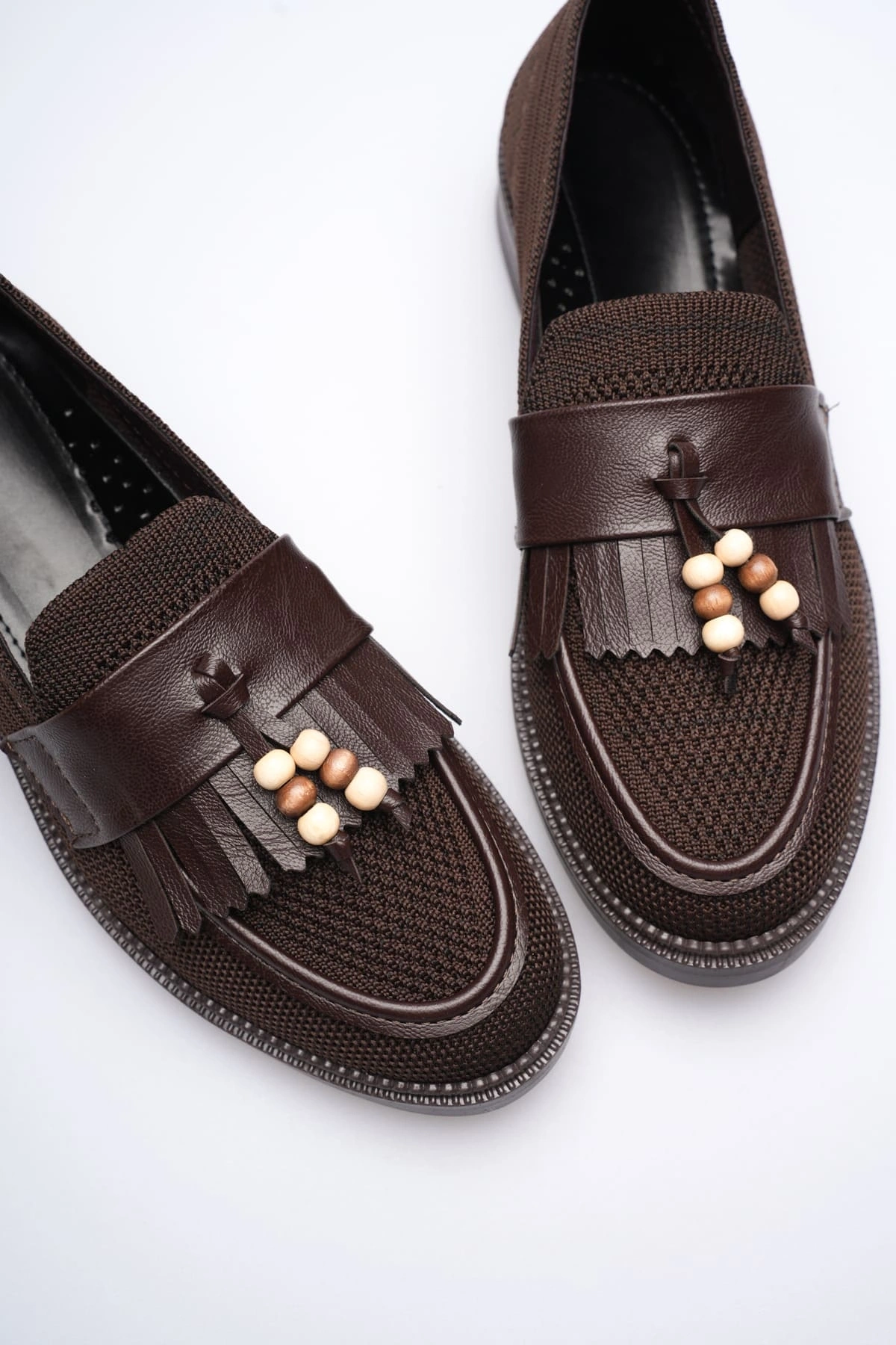 Kadın Acı Kahve Boncuk Püsküllü Günlük Kısa Topuklu Ayakkabı TR30MS01C