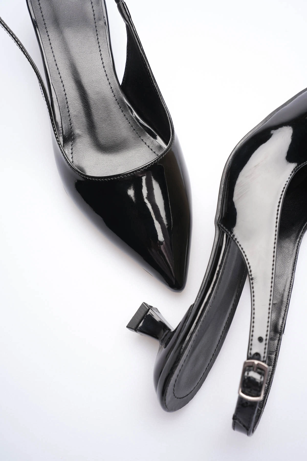 Kadın Siyah Rugan Sivri Burun Slingback Kısa Topuklu Ayakkabı TR20MS04E